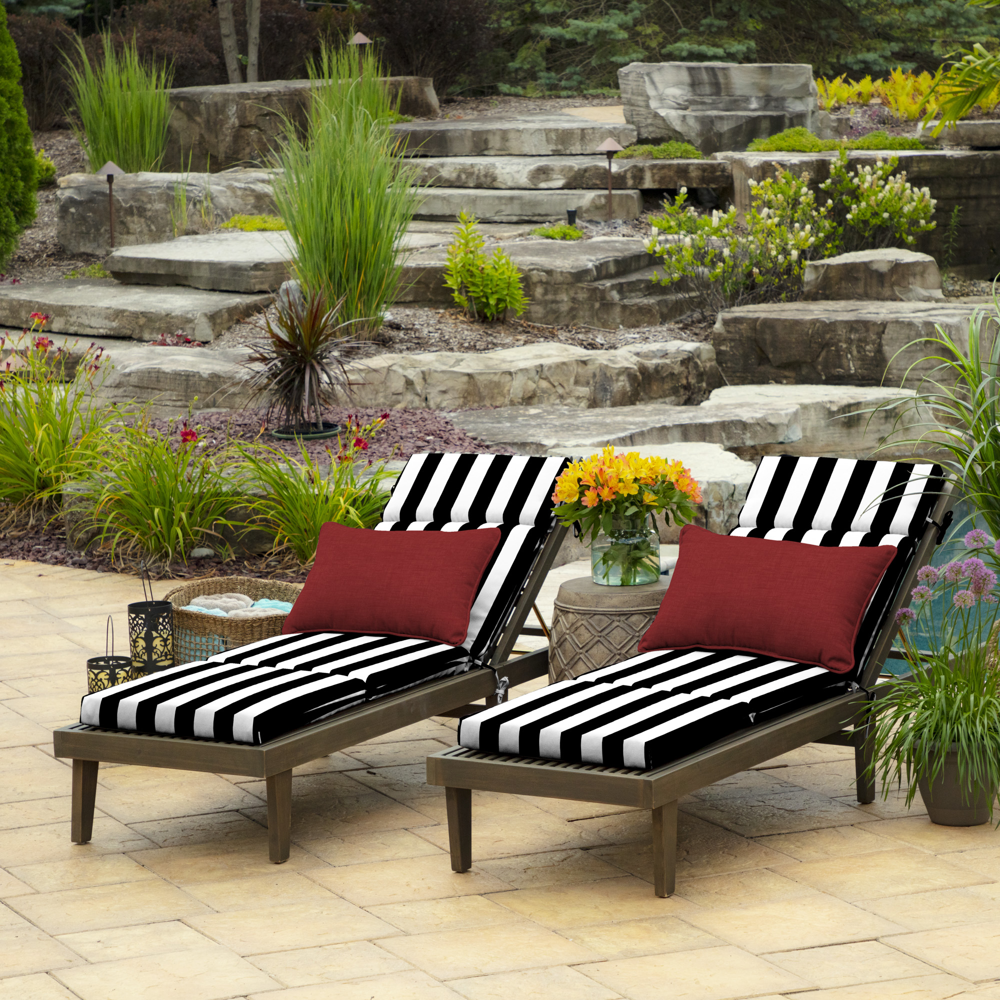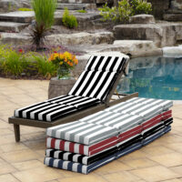 The Arden Selections Outdoor Chaise Cushion adds an element of relaxation and fashion to your outdoor chaise lounge, so you can relax in a space and style that is all your own. This cushion measures 21″ W x 72″ L x 2.5″ H and has 4 sets of ties, so it can fit a variety of chaise lounge styles. Our EverTru® Printed Polyester outdoor fabric is fade resistant and offers easy cleaning with just soap and water. Inside this outdoor cushion is patented 100% EverLuxe polyester fiberfill to help it retain shape and provide long-lasting comfort during outdoor use. Fibers within are oriented in a vertical position, which provides structure and springing replacement patio cushions. This outdoor cushion is UV treated and is intended for use on your patio or deck; however, we recommend bringing it indoors when it rains or when not in use to preserve its lifespan and keep it looking beautiful.