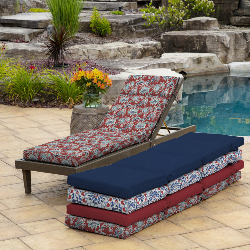 The Arden Selections Outdoor Chaise Cushion adds an element of relaxation and fashion to your outdoor chaise lounge, so you can relax in a space and style that is all your own. This cushion measures 21″ W x 72″ L x 2.5″ H and has 4 sets of ties, so it can fit a variety of chaise lounge styles. Our EverTru® Printed Polyester outdoor fabric is fade resistant and offers easy cleaning with just soap and water. Inside this outdoor cushion is patented 100% EverLuxe polyester fiberfill to help it retain shape and provide long-lasting comfort during outdoor use. Fibers within are oriented in a vertical position, which provides structure and springing replacement patio cushions. This outdoor cushion is UV treated and is intended for use on your patio or deck; however, we recommend bringing it indoors when it rains or when not in use to preserve its lifespan and keep it looking beautiful.