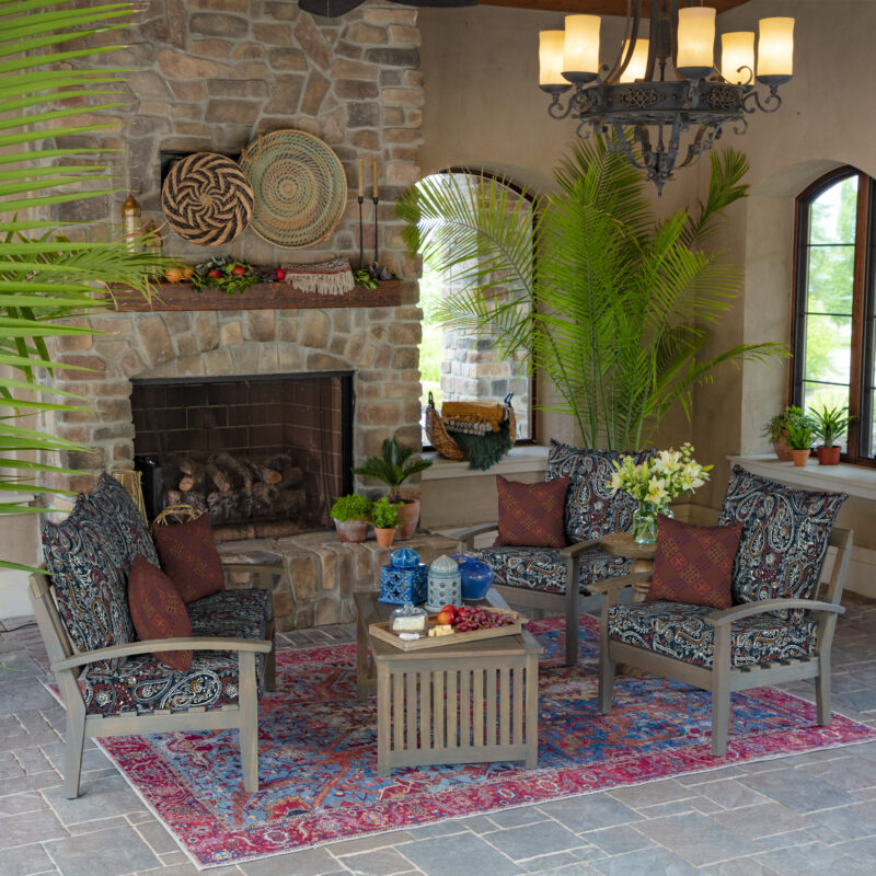 This outdoor cushion set is UV treated and is intended for use on your patio or deck, however we recommend bringing it indoors when it rains or when not in use to preserve its lifespan and keep it looking beautiful.